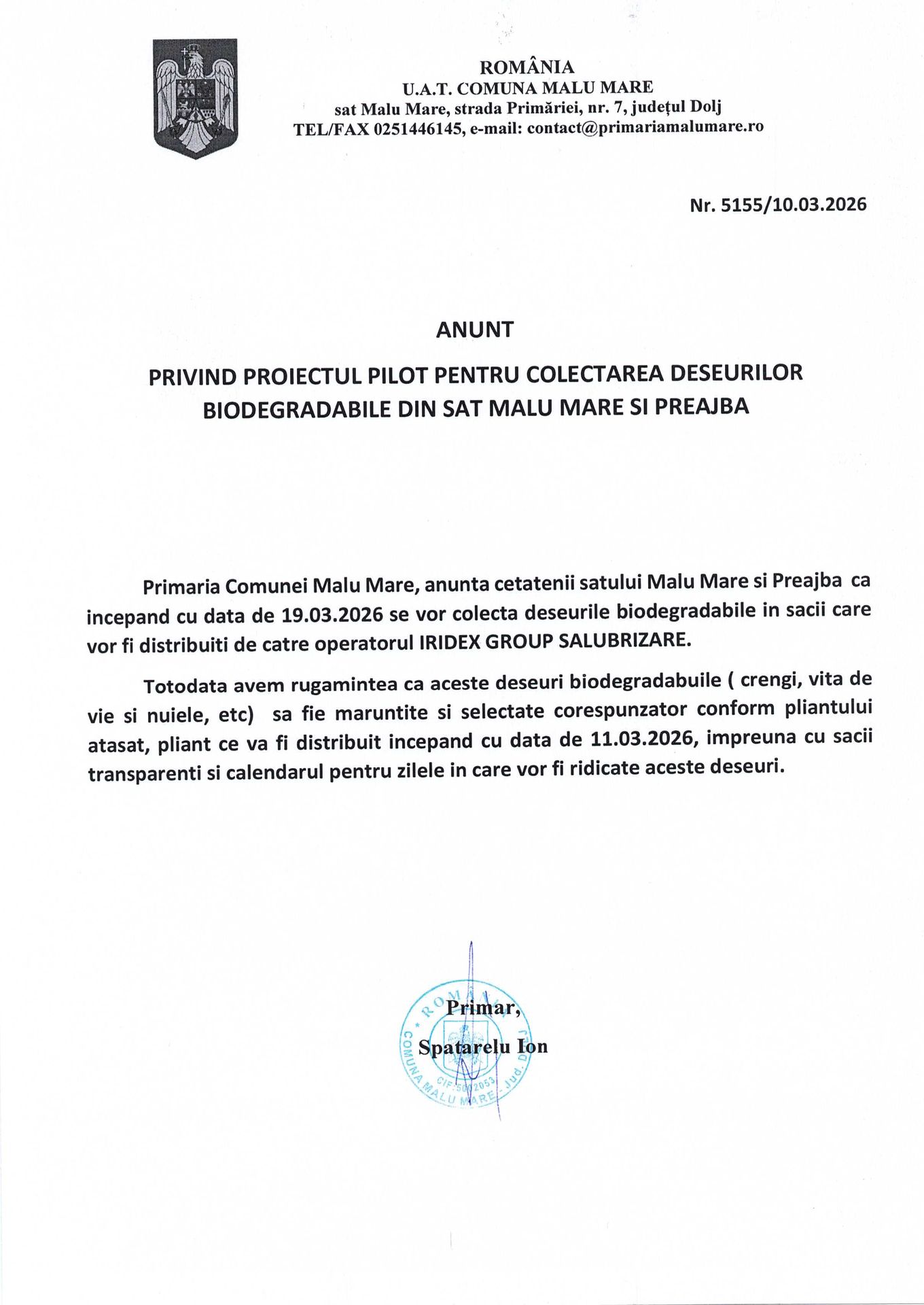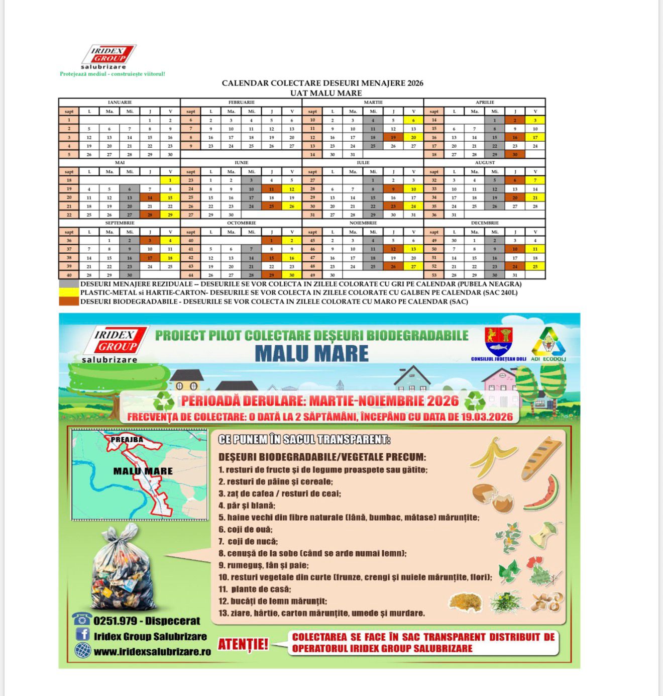 Anunt colectare deseuri biodegradabile sat Malu Mare si sat Preajba-veche