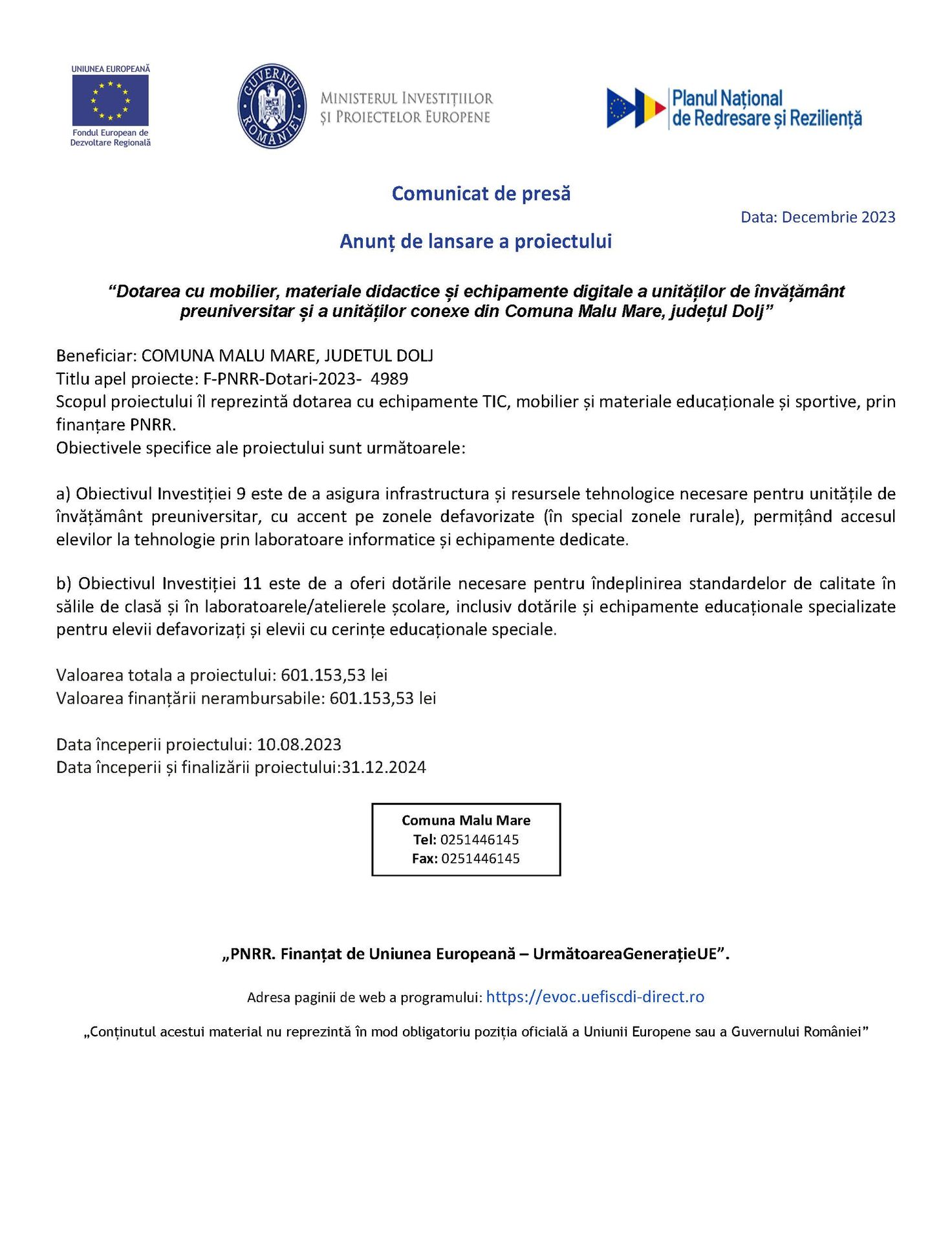 Anunt de lansare a proiectului