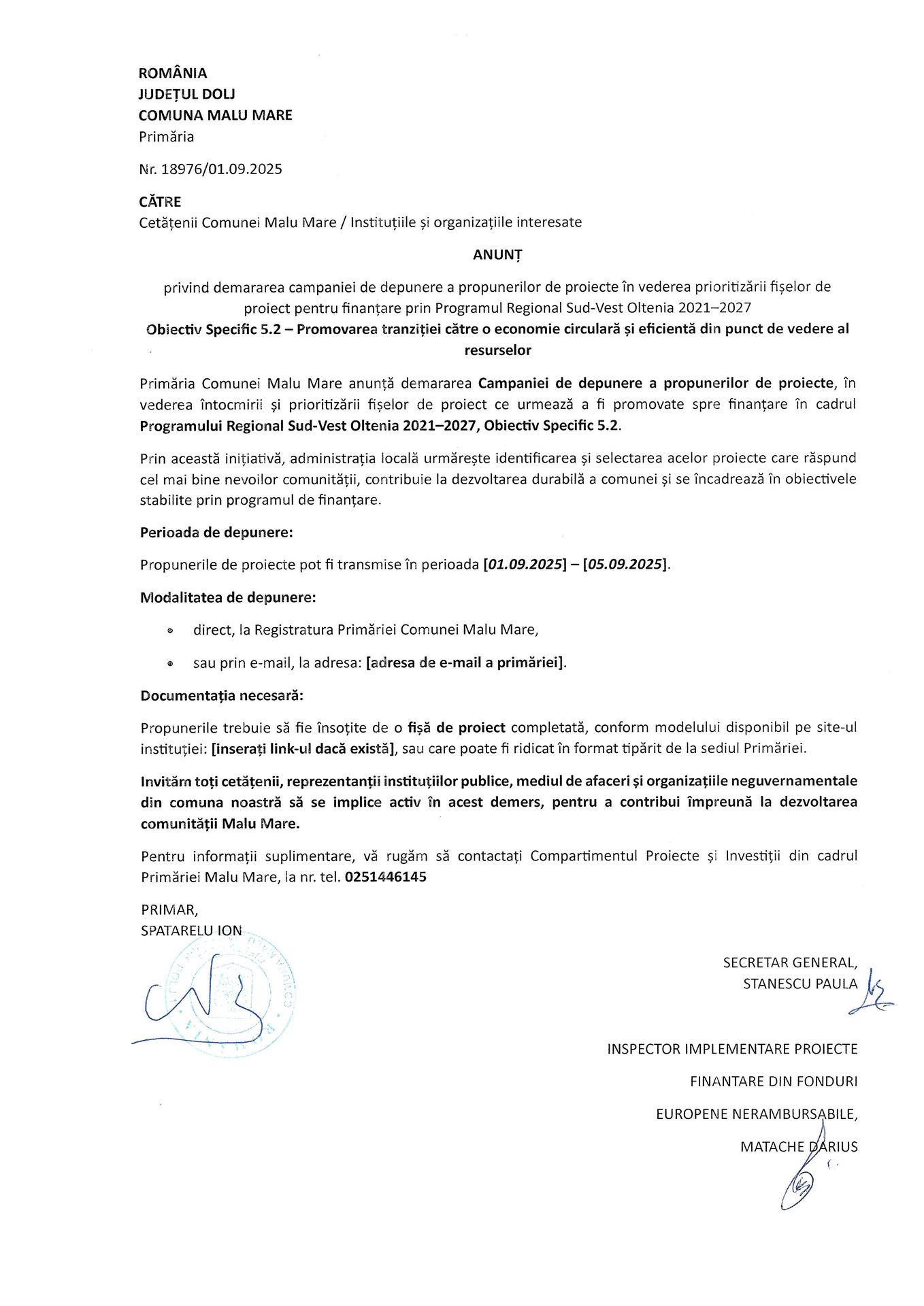 Anunt modificare Strategie de Dezvoltare Locală a comunei Malu Mare 2021-2027